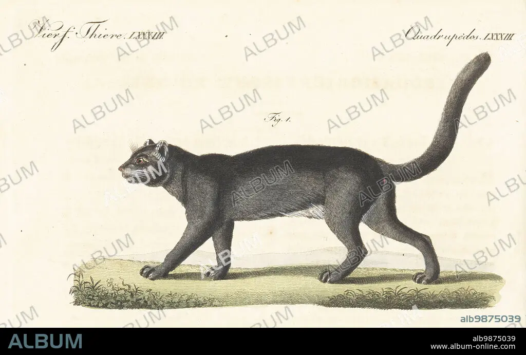 Jaguarundi, Herpailurus yagouaroundi. Wild cat native to South and Central America, also known as the eyra, gato moro, tigrillo. Le yaguarundi, Felis yaguarundi. Handcoloured copperplate engraving by Th. Goetz from Carl Bertuch's Bilderbuch fur Kinder (Picture Book for Children), Weimar, 1815. A 12-volume encyclopedia for children illustrated with almost 1,200 engraved plates on natural history, science, costume, mythology, etc., published from 1790-1830.