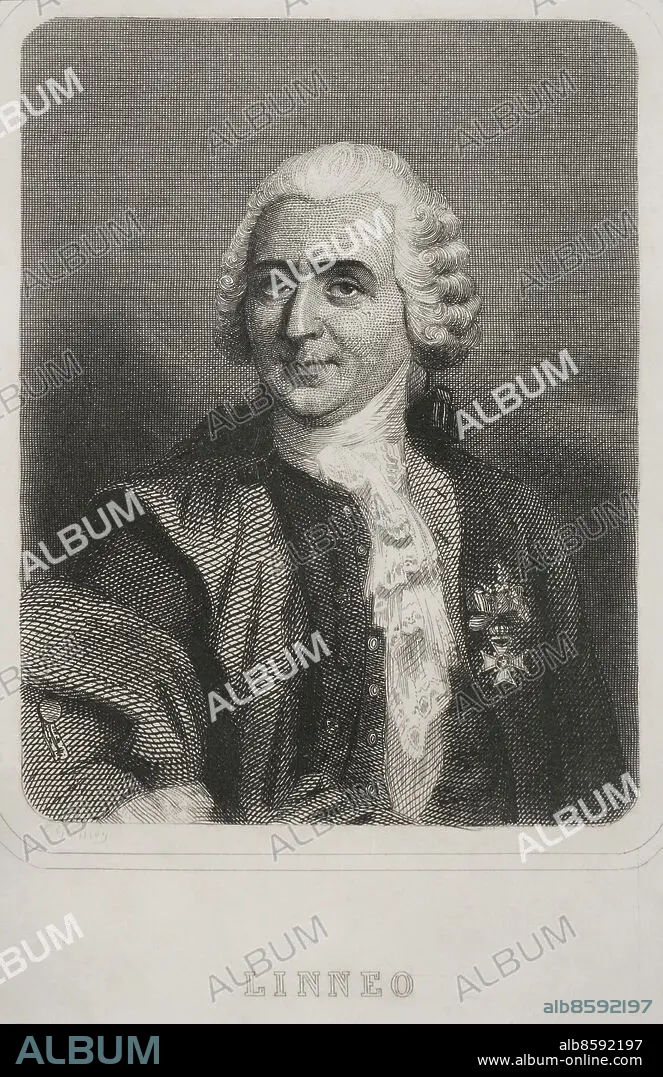 CHARLES GEOFFROY (1819-1882). FRENCH ENGRAVER.. Carl Linnaeus (1707-1778). Swedish naturalist and botanist. He established binomial nomenclature. Portrait. Engraving by Geoffroy. "Historia Universal", by César Cantú. Volume VI. 1857.