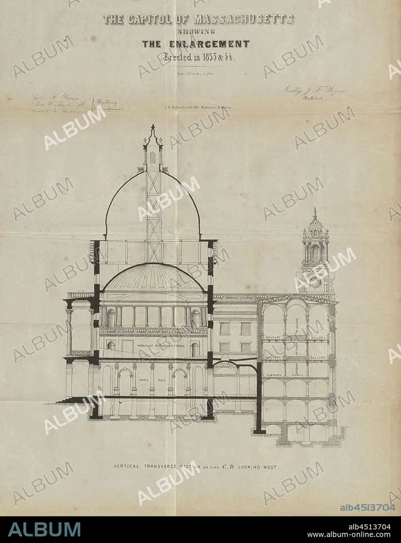 The Capital of Massachusetts showing the enlargement Erected in 1853, Cross section of the Massachusetts State House in Boston, signed: Gridley J. F. Bryant; J.H. Bufford's Lith, Fig. 9, p. 23, Bryant, Gridley J. F. (del.); Bufford, John Henry (sc.), 1854, Report of the commissioners for the enlargement of the State House. [Boston]: [s. n.], [1854].