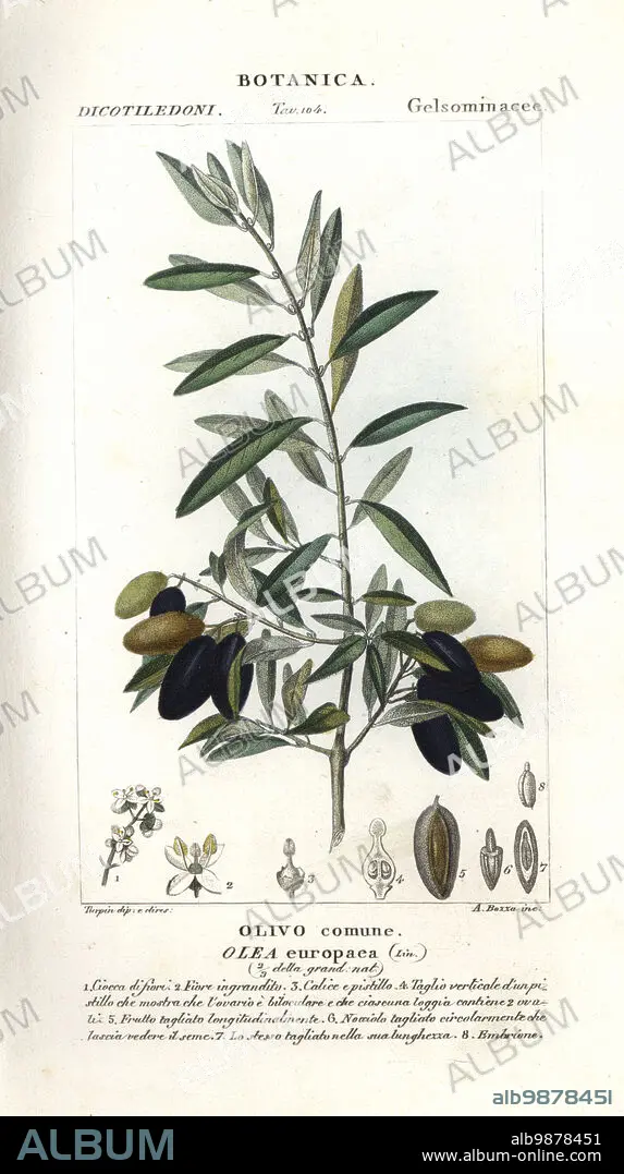 Olive tree, Olea europaea. Handcoloured copperplate stipple engraving from Jussieu's Dizionario delle Scienze Naturali, Dictionary of Natural Science, Florence, Italy, 1837. Illustration engraved by A. Bozza, drawn and directed by Pierre Jean-Francois Turpin, and published by Batelli e Figli. Turpin (1775-1840) is considered one of the greatest French botanical illustrators of the 19th century.