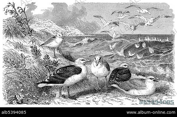 Historical graphic representation, animal drawing of Great Black-backed gulls (Larus marinus) and Herring gulls (Larus argentatus), 19th century, from Meyers Konversations-Lexikon encyclopaedia, 1890