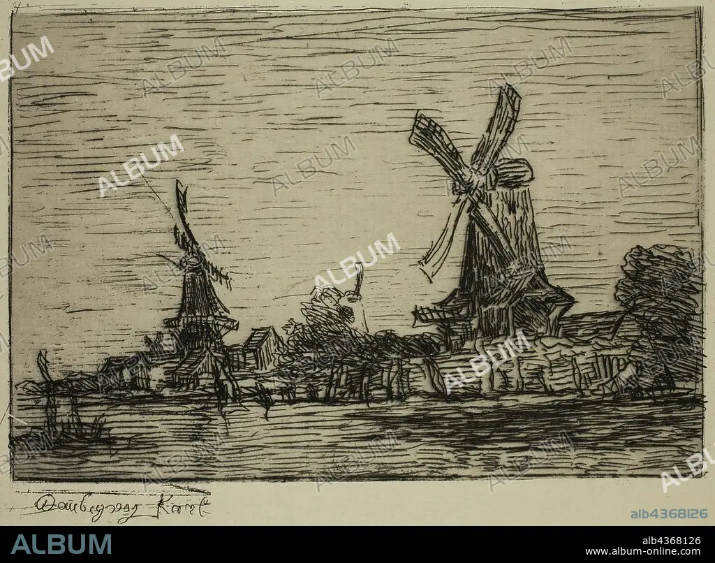 Karl Pierre Daubigny, French, 1846-1886, Windmills, 19th Century, Etching printed in black on japan paper, plate: 5 x 6 3/8 in.