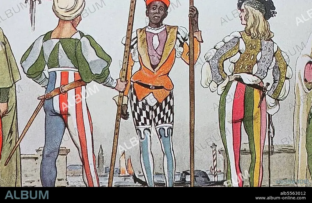 Kleidung, Mode in Italien zur Zeit der Hochrenaissance um 1500, von links, ein junger Mann aus Padua, ein Soldat mit Turban, ein venezianischer Neger als Gondelführer und ein junger Mann aus Siena, digital restaurierte Reproduktion einer Originalvorlage aus dem 19. Jahrhundert