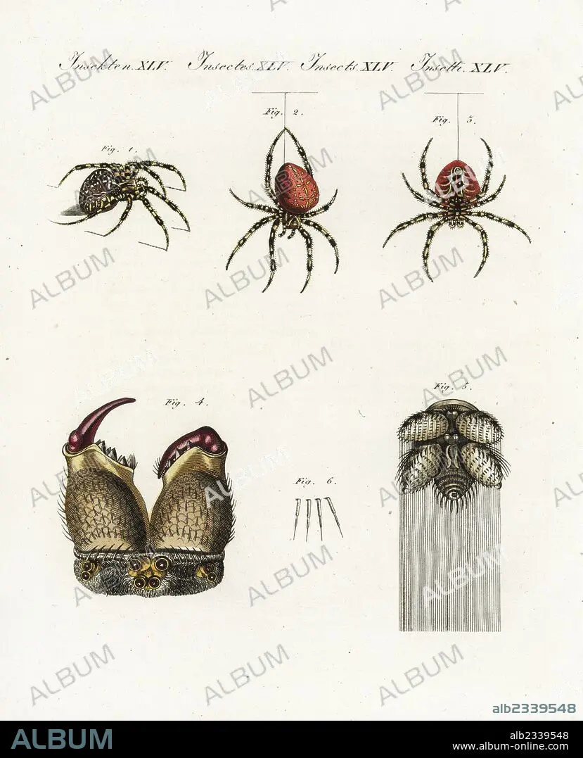 European garden spider, diadem spider, Araneus diadematus. Black variety 1, red variety hanging from a silk line 2,3, front of head showing eyes and mandibles 4, silk spinnerets with fibres, and silk tubes 6. Handcoloured copperplate engraving from Bertuch's "Bilderbuch fur Kinder" (Picture Book for Children), Weimar, 1805. Friedrich Johann Bertuch (1747-1822) was a German publisher and man of arts most famous for his 12-volume encyclopedia for children illustrated with 1,200 engraved plates on natural history, science, costume, mythology, etc., published from 1790-1830.