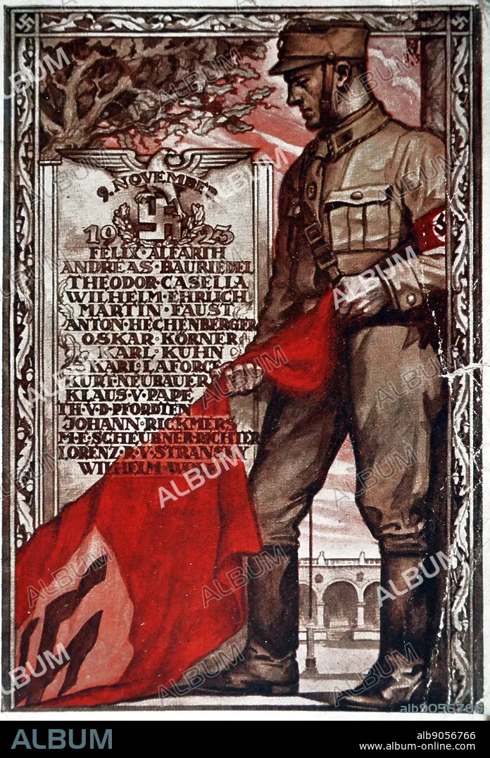 commemorative postcard issued to mark the 10th anniversary of the Beer Hall Putsch, also known as the Munich Putsch, a failed attempt by the Nazi Party leader Adolf Hitler with Erich Ludendorff and other leaders to seize power in Munich, Bavaria, during 89 November 1923. Around two-thousand men marched to the centre of Munich and, in the ensuing confrontation with police forces, sixteen Nazis and four policemen were killed.