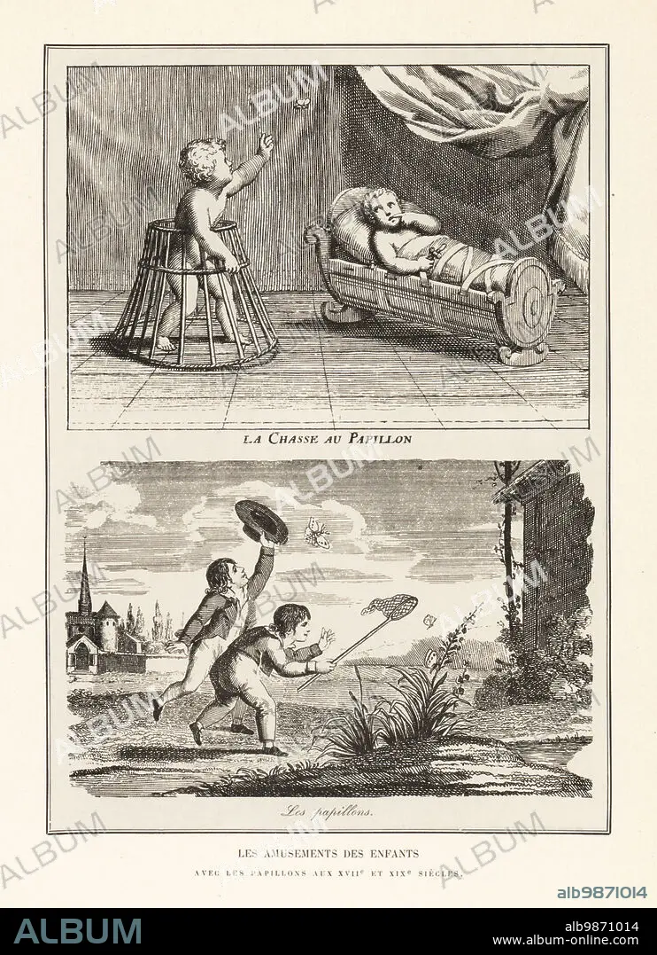 Children playing games with butterflies. A toddler chases an insect in a bedroom, 17th century print. Two boys chase butterflies with nets and hats, 19th century print. Les amusements des enfants. Les papillons. Lithograph from Henry Rene dAllemagnes Recreations et Passe-Temps, Games and Pastimes, Hachette, Paris, 1906.