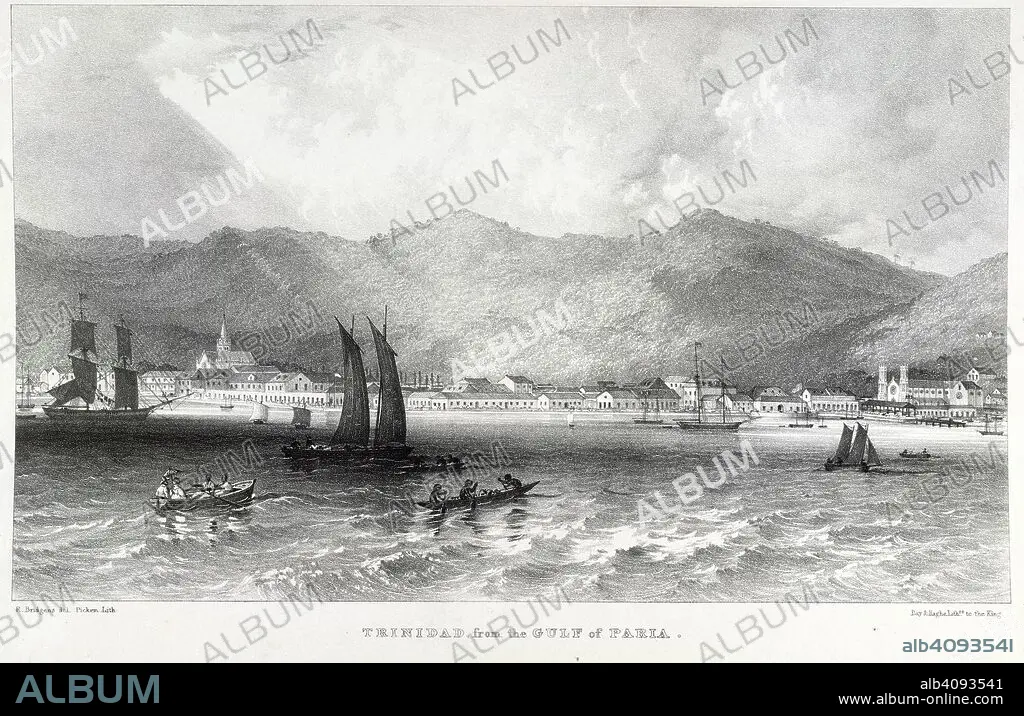 RICHARD BRIDGENS. Trinidad, from the Gulf of Paria. West India Scenery, with illustrations of negro character, the process of making sugar, &c., from sketches taken during a voyage to, and residence of seven years in, the island of Trinidad. [Plates, with accompanying text.]. R. Jennings & Co.: London, [1836?]. Port of Spain, Trinidad. Image taken from West India Scenery, with illustrations of negro character, the process of making sugar, &c., from sketches taken during a voyage to, and residence of seven years in, the island of Trinidad. [Plates, with accompanying text.]. Source: 789.g.13, plate 5. Language: English.