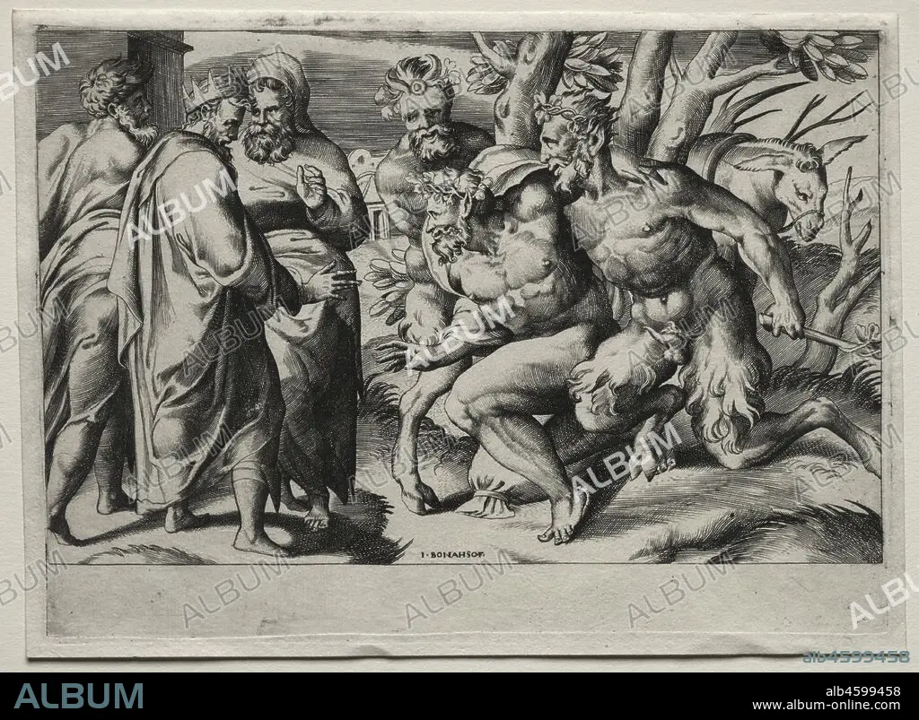Silenus and King Midas, mid 16th century. In Greek mythology Silenus was an old, drunken satyr (half-man, half-goat), who visited King Midas and was graciously received. In gratitude for Midas's generous hospitality, Dionysus, the god of wine and former pupil of Silenus, granted the king one wish. Midas asked for the power to turn everything that he touched into gold. However, he soon regretted his choice, for he was unable to eat food or drink water, as they also turned to gold. Finally, Dionysus released him from the enchantment.