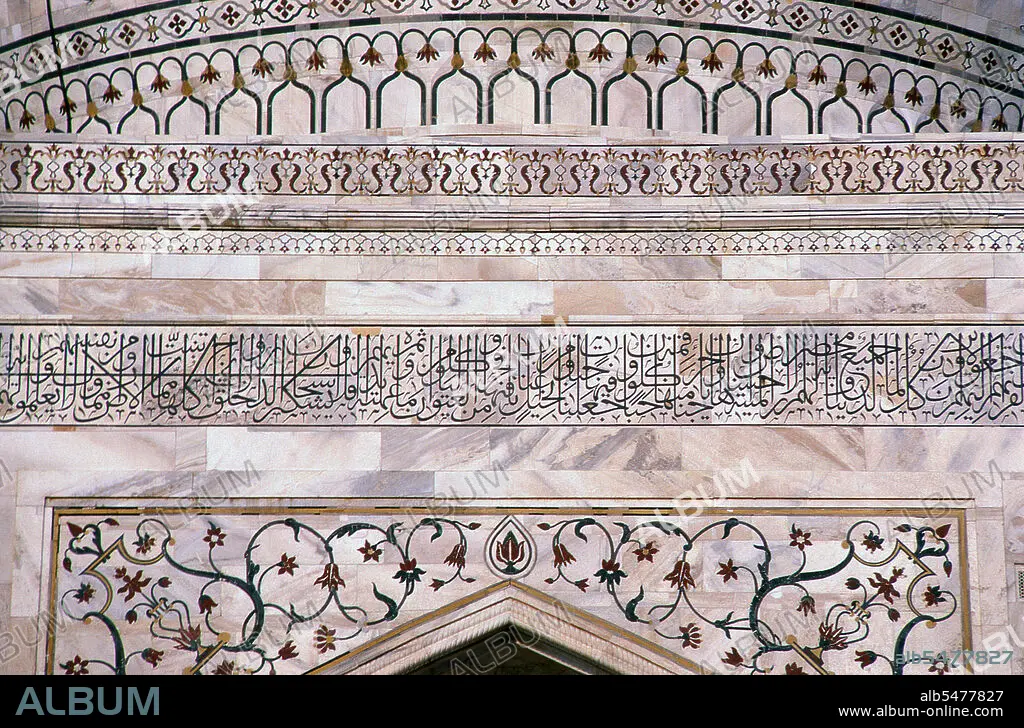 Titre: Koranic verse and abstract motifs on the western facade of the Taj Mahal at sunset, Agra, Uttar Pradesh.