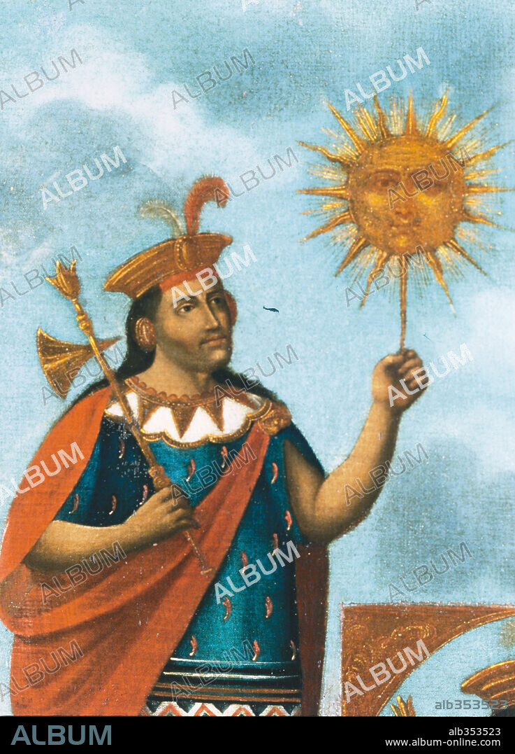 Manco Capac, fundador del Imperio Inca. Detail from Geneaology 18th century. Cuzco School.