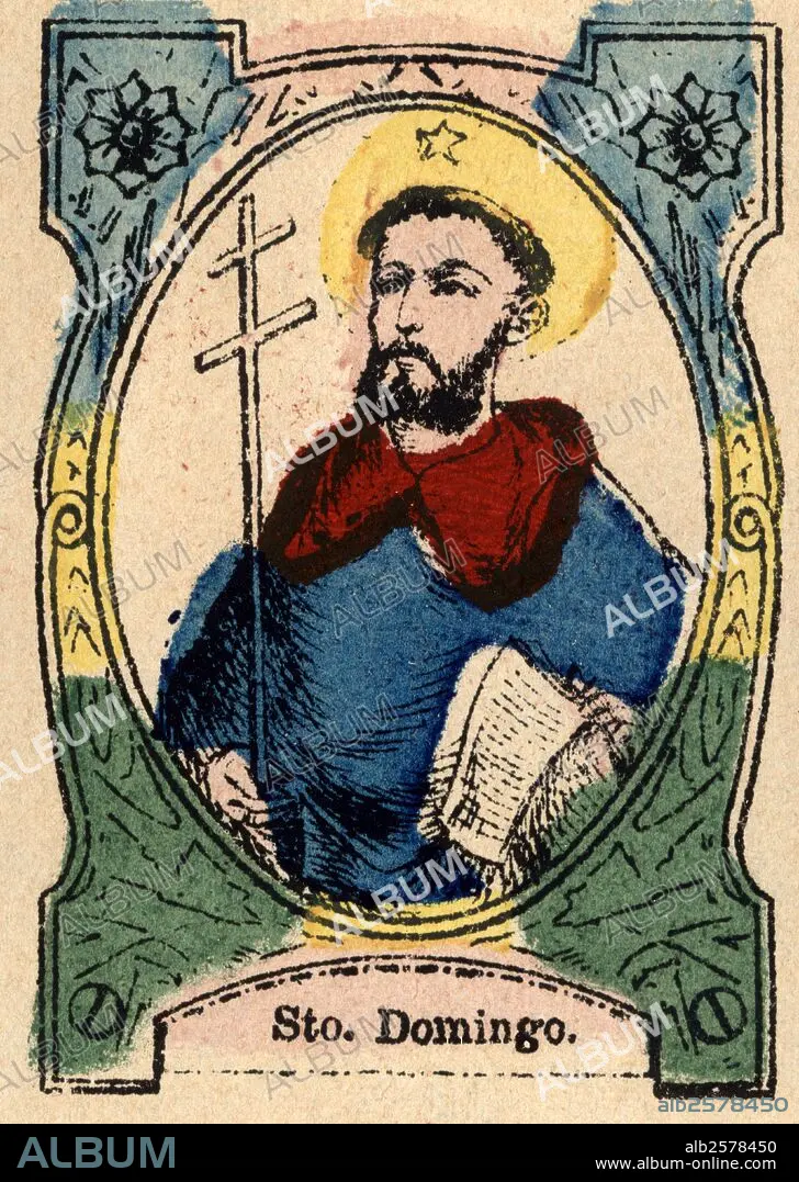 Santo Domingo de Guzmán (1170-1221), religioso español, fundador de la orden de los dominicos. Grabado popular pintado a la trepa en 1870.