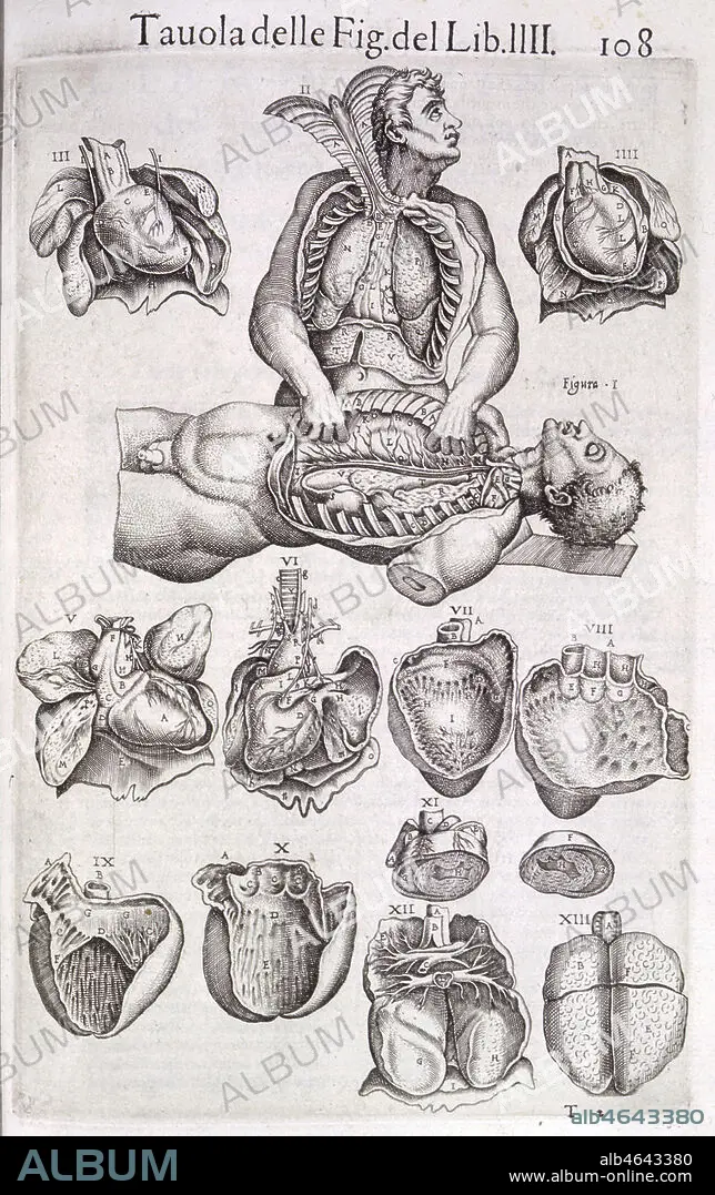 Planche anatomique d'un ecorche et du coeur tiree de Anatomia del corpo humano par Juan VALVERDE DE AMUSCO (c.1525-c.1588) edite par Antonio SALAMANCA et Ant. LAFRERY en 1560. Credit: Collection KHARBINE-TAPABOR.