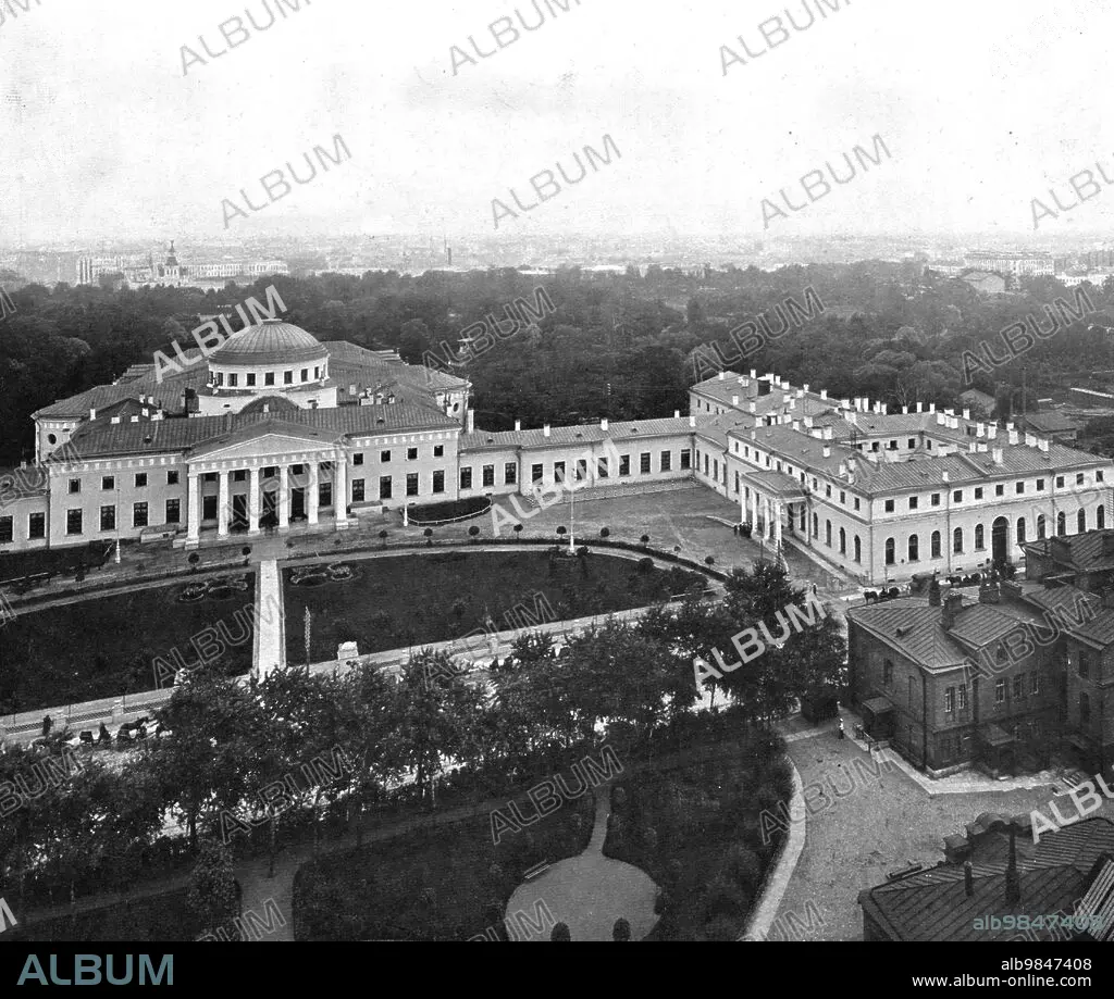 'Au Palais de Tauride; Le palais de Tauride, siege de la Douma et centre de la revolution russe; l'edifice comprend une aile gauche, symetrique à l'aile droite que montre cette photographie', 1917. The Tauride Palace (in Saint Petersburg), seat of the Duma and centre of the Russian Revolution; the building has a left (east) wing, symmetrical to the right (west) wing, shown in the photograph. From "L'Album de la Guerre 1914-1919, Volume 2" [L'Illustration, Paris, 1924].