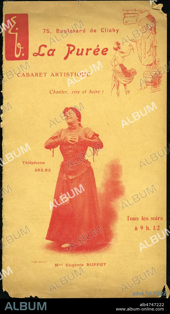 Légende: 'Chanter, rire et boire !'. Portrait d'Eugenie BUFFET (1866-1934). Couverture d'une brochure publicitaire vers 1905 pour le cabaret La Puree, boulevard de Clichy a Paris. Photographie ELVIRE et illustration WILLETTE. Credit : Collection IM/KHARBINE-TAPABOR.