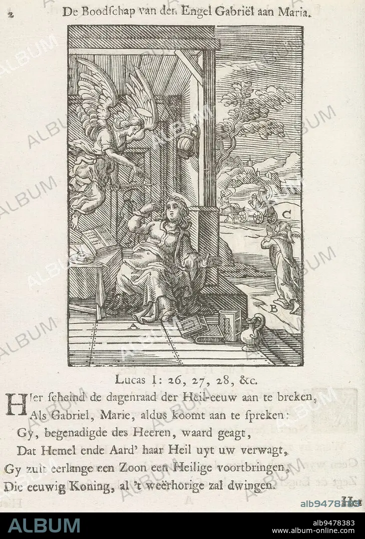 Phillippus is sent by an angel to a eunuch, Annunciation, The message of the angel Gabriel to Mary (title on object), An angel appears before Philip and sends the apostle to the deserted road between Jerusalem and Gaza. Used here as a depiction of the annunciation. Above the representation a title. Below, six verses and a reference to Luke 1: 26-28. The print is part of an album., print maker: Christoffel van Sichem (II), (mentioned on object), after print by: Philips Galle, after design by: Maarten van Heemskerck, print maker: Amsterdam, after print by: Antwerp, publisher: Amsterdam, in or after 1629 - in or before 1646 and/or 1740, paper, letterpress printing, height 110 mm × width 76 mm, height 168 mm × width 135 mm