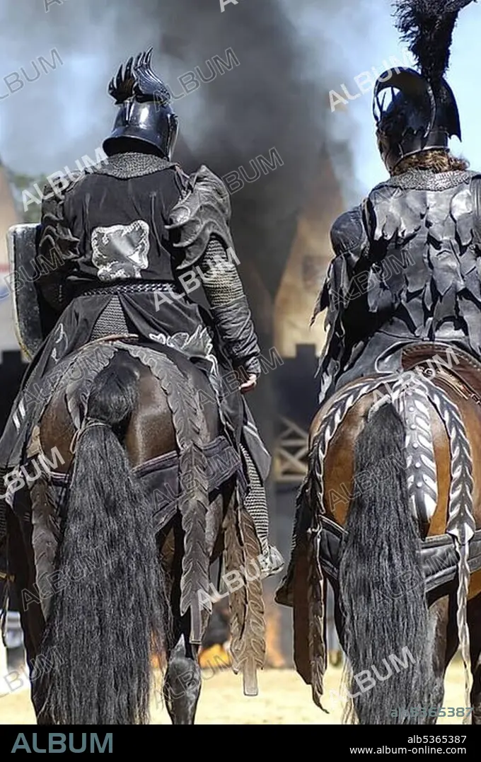 Two black knights from behind sit in their horses, in the background black cloud of smoke, knight festival Kaltenberger Ritterspiele, Kaltenberg, Upper Bavaria, Germany, Europe.