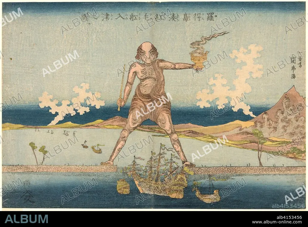 Dutch Ships Entering the Port of the Island of Rhodes (Rokosuto minato Oranda fune nyushin no zu). Utagawa Kunitora; Japanese, active c. 1804-44. Date: 1813-1835. Dimensions: 24.6 x 36 cm (9 11/16 x 14 3/16 in.). Color woodblock print; oban. Origin: Japan.