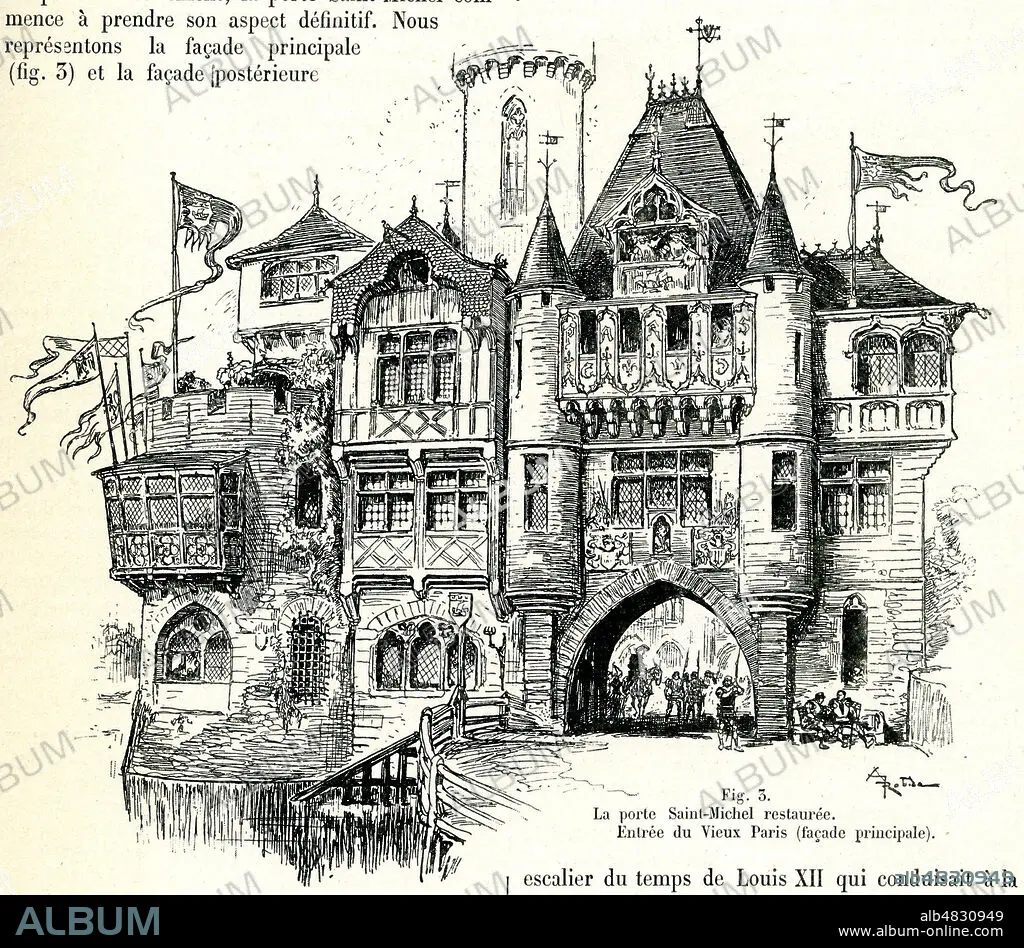 'La porte Saint-Michel restauree. Entree du vieux Paris (facade principale)'. Porte Gibard ou porte d'Enfer. Restauration du vieux Paris pour l'Exposition universelle 1900. Illustration par Robida (1848-1926) tiree de la revue La Nature du 25 mars 1899. Credit : Collection KHARBINE-TAPABOR.