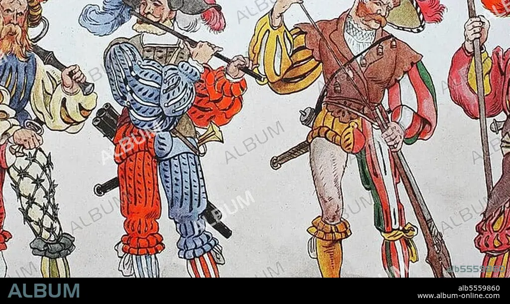Kleidung, Mode der Landsknechte in Deutschland um 1500-1540, die Schlitzuniform der Landsknechte, die Schlitztracht, sog. mi-parti, mit Schlitzen an den Ärmeln, Wams und Beinkleidern, digital restaurierte Reproduktion einer Originalvorlage aus dem 19. Jahrhundert