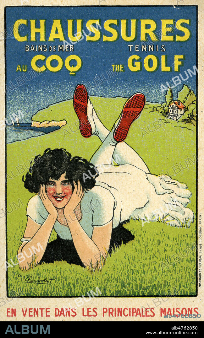 Chaussures Bains de mer, Au Coq (coq sportif ?) , Chaussures Tennis, The Golf, pub annees 20. Carte postale publicitaire, debut 20eme siecle. Credit IM/KHARBINE TAPABOR
