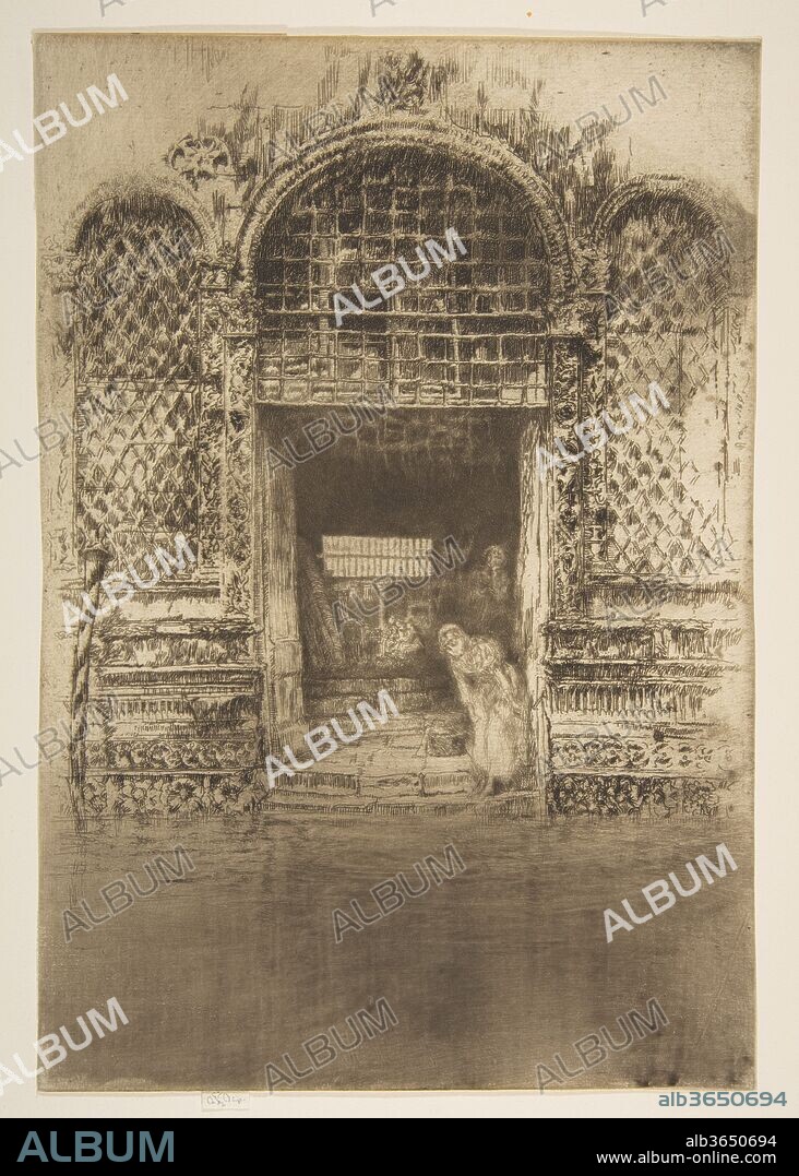 Richly ornamented panels surround a central void and invite us into the shadowed interior of the Palazzo Gussoni, with a sunlit courtyard glimpsed beyond. This etching belongs to Whistler's "First Venice Set," and the artist found his subject on the Rio de la Fava canal, east of the Rialto. The dark interior space seems dappled with reflected light shining through a grid that fills the central arch. Close inspection, however, reveals the shapes to be chairs hanging from the ceiling. Whistler undoubtedly planned this coincidence of patterning and avoided clarifying the details. His interest in shifting light led him to devote one-third of the sheet to the foreground canal, where subtly manipulated plate tone contrasts suggested depth with reflected surface.