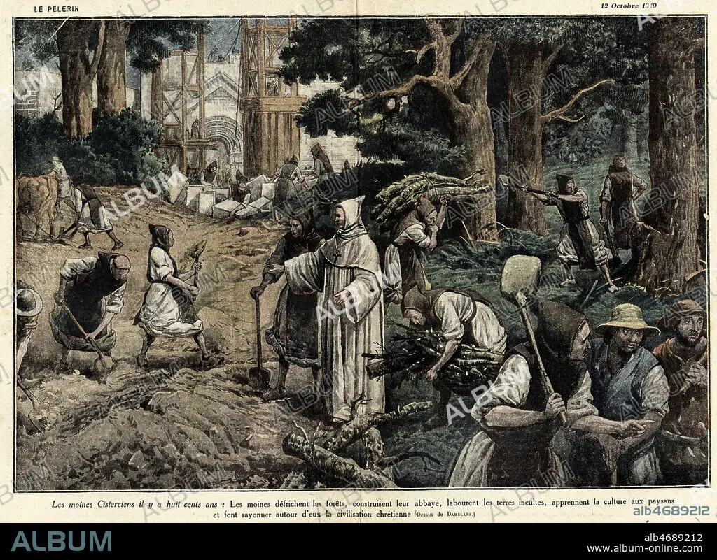 'Les moines Cisterciens il y a 800 ans : les moines defrichent les forets, construisent leur abbaye, labourent les terres incultes, apprennent la cullture aux paysans et font rayonner autour d'eux la civilisation chretienne'. Illustration par DAMBLANS (1865-1945) pour Le Pelerin du 12 octobre 1919. Credit : Collection KHARBINE-TAPABOR.