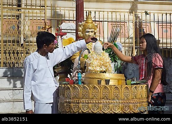 Burmese people sacrificing in front of the Shwedagon Pagoda, Buddhist temple, Rangoon, Yangon, Burma, Burma, Myanmar, Asia.