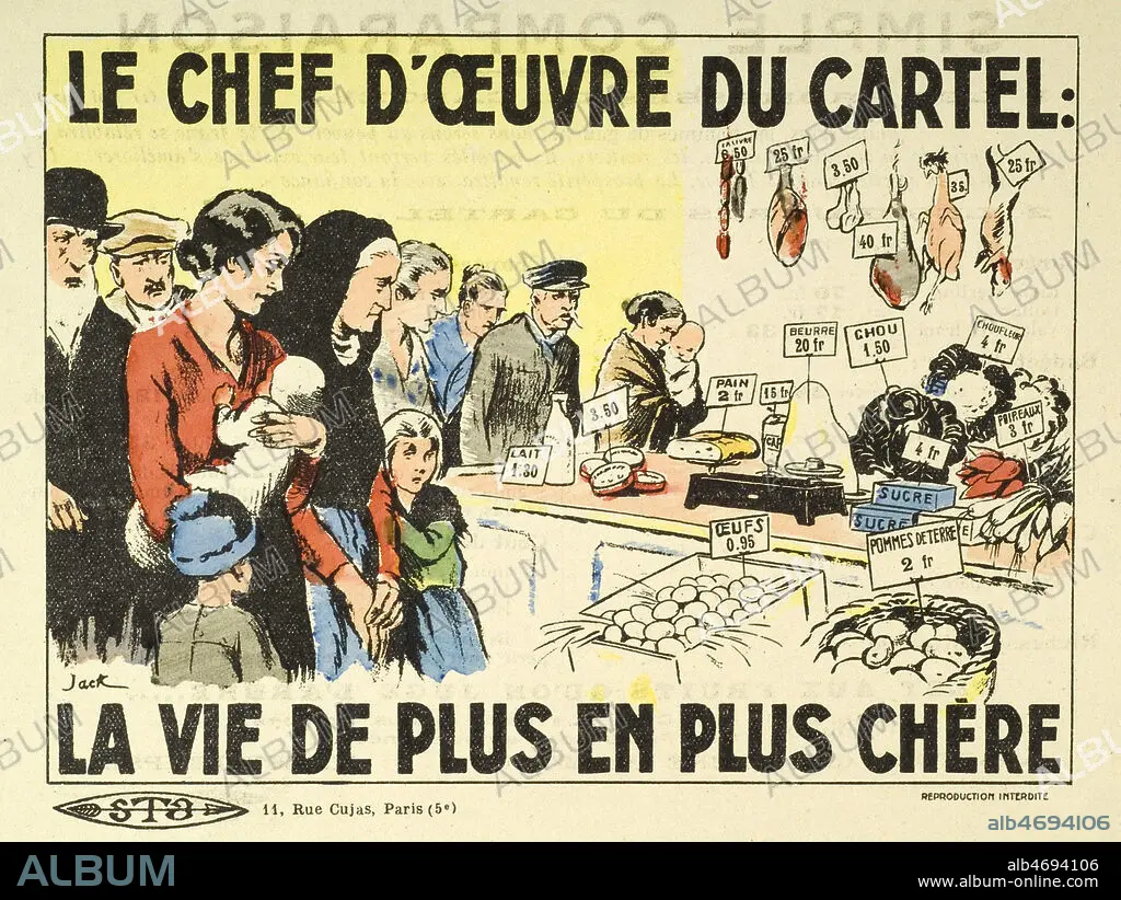 Légende: Tract de droite contre le Cartel des gauches de 1926: ' le chef d'oeuvre du Cartel: la vie de plus en plus chere. Illustration de JACK (DR). Credit: Coll. Dixmier/KHARBINE-TAPABOR.